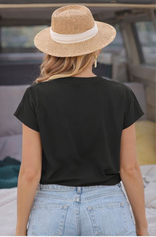 WOMEN`S BLACK ROUND NECK RUFFLE TOP