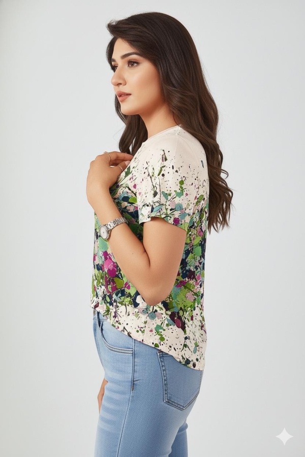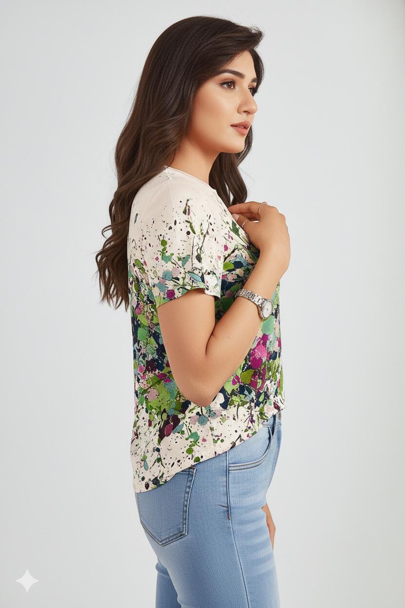 WOMEN`S MULTI PRINTED GREEN T-SHIRT